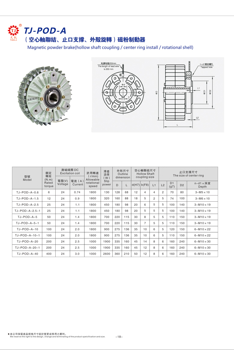 POD-A孔式外旋磁粉制动器的线圈静止型产品又有外壳静止和外壳旋转二种类型。对于外壳静止的产品,静止线圈位于转子的外部,对于外壳旋转的产品,静止线圈位于转子的内部。根据输出转子工作面的形状不同,常用的产品有圆柱形转子、杯形转子和盘形转子之分。