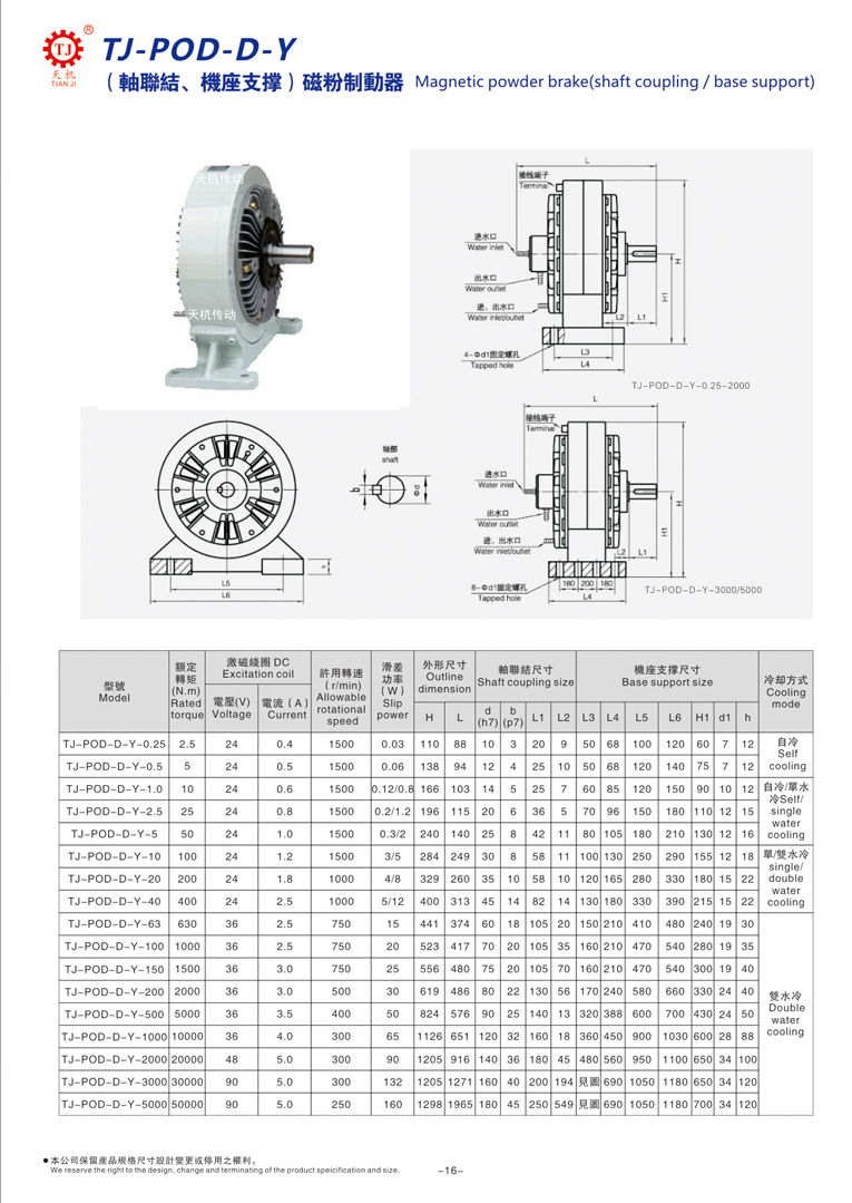 POD-D-Y磁粉制动器水冷式激磁线圈无电流通过时,工作腔中的磁粉呈松散状态。在主动转子所产生的离心力的作用下,磁粉被均匀地甩在主动转子的内壁上,主、从动转子之间屋里的相互作用,磁粉离合器处于分离状态,没有转矩的传递。