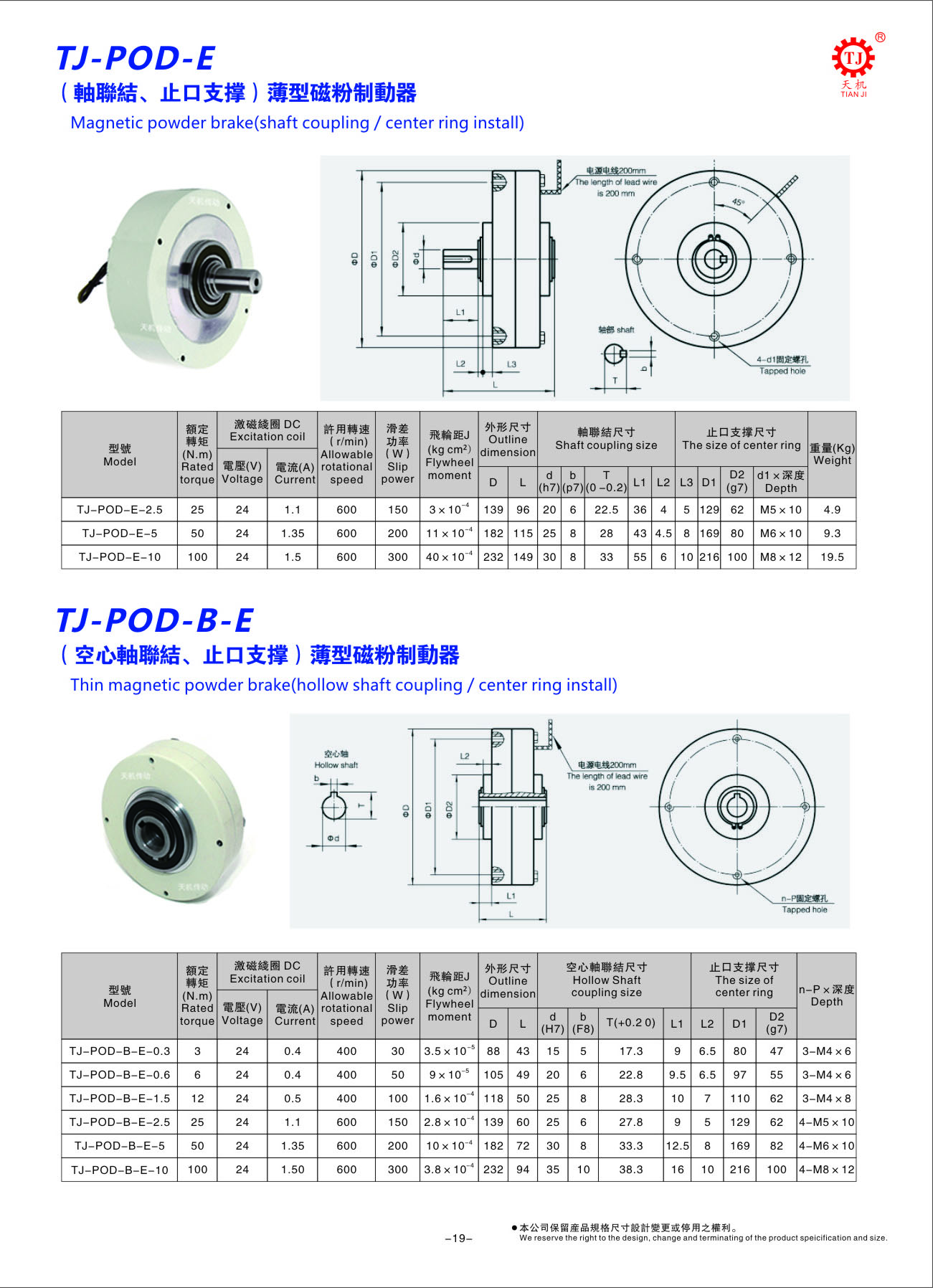 该型(TJ-POD-B-E)磁粉制动器为空心轴型自动冷却式制动器,构造精度高,高精密。由于其体积比较小,有效地降低旋转部的惯性力矩,安装方便简单、耐温、耐用。注意的是:在空转的状态下,其空转转矩在400r/min时不宜超过额定转矩的3%,在600r/min时不宜超过额定转矩的5%。