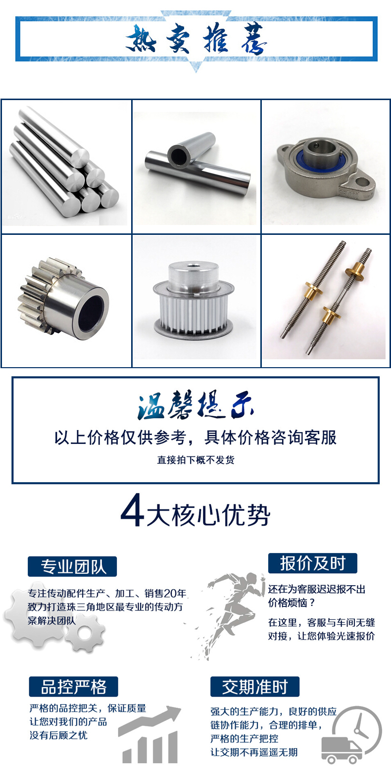 2、链轮结构,小直径链轮一般做成整体式,中等直径链轮多做成辐板式,为便于搬运、装卡和减重,在辐板上开孔,大直径链轮可做成组合式,此时齿圈与轮芯可用不同材料制造!例如C45,不锈钢等材料。