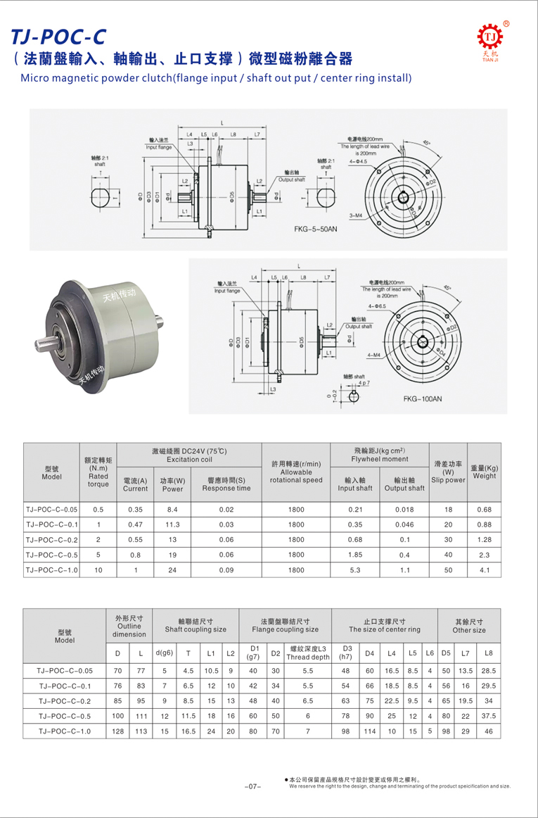 POC-C微型磁粉式离合器切断电流时,磁通随激磁电流的消失而消失,磁粉在重力的作用下又重新处于松散状态,并在离心力的作用下,被甩在主动转子的内壁上,磁粉离合器又处于分离的状态。
