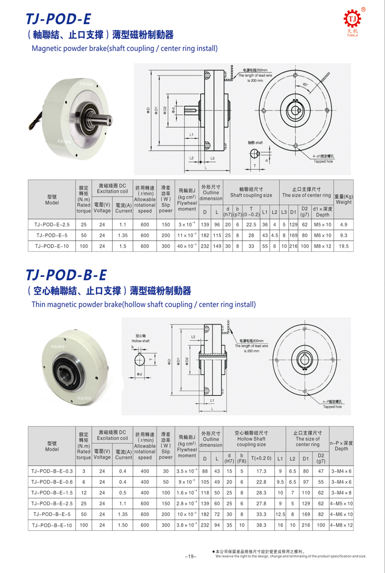 POD-E单轴薄型磁粉制动器用途:1、缓冲起动,停止用:利用连结时的圆滑特性及定转矩特性达到缓冲起动和停止。2、连续滑动、张力控制用3、转矩限制器用4、高速应答用5、动力吸收用6、定位停止用7、模拟负载用
