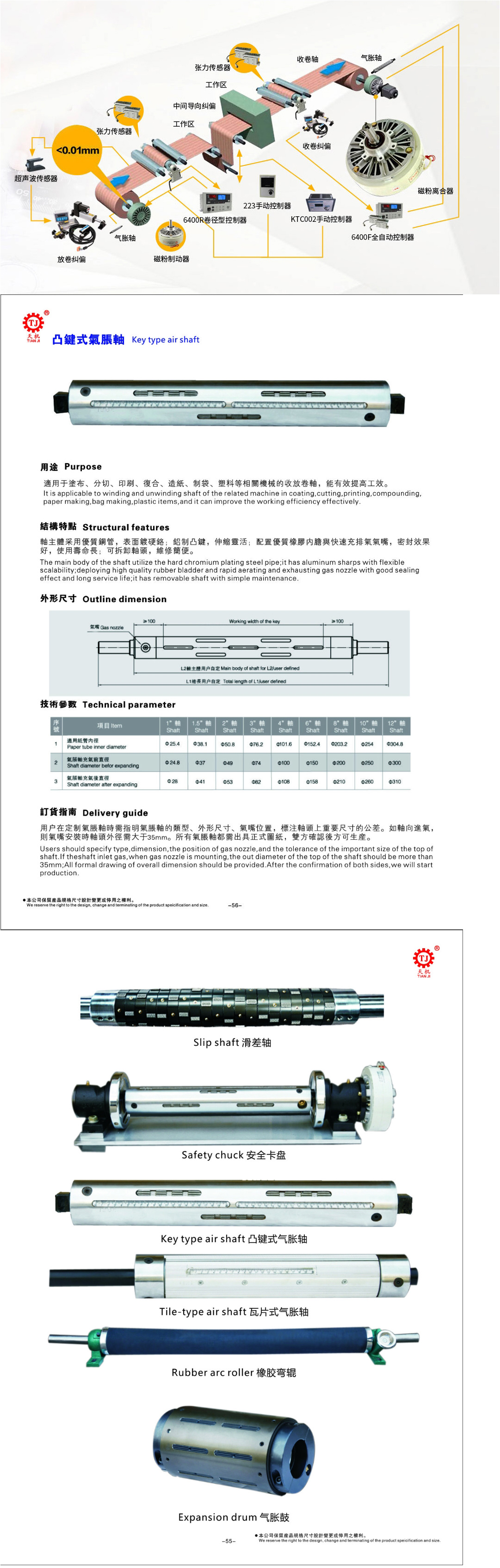 的适用范围:键条式气胀轴膨胀起的是单个键条,支点扩散到各个键条,平衡受力,可适用机械收卷承载量较重的物品,例如:布匹、纸品、薄膜、印刷品、皮革、复合材料等,适用于涂布、分切、印刷、复卷、复合、造纸、制袋、塑料等相关机械的收放卷轴、能有效提高工效。