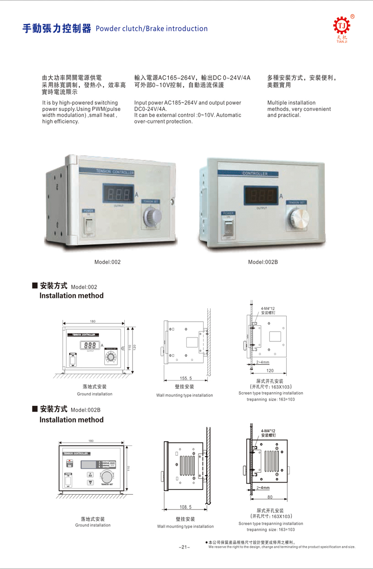 上海手动KTC002张力控制器整离合器或制动器的激磁电流,从而获得一致的张力张力控制器。 半自动张力控制器又称卷径检出式或开波式张力控制器,是于收料及放料自动检出卷径,从而调整卷料的力.